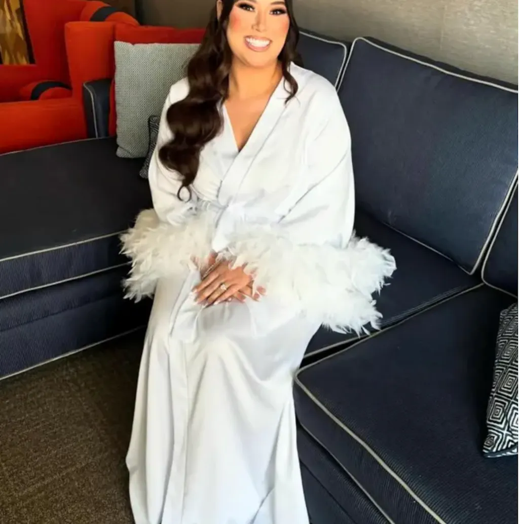This white long bridal robe is made from the softest fabric and features a stunningΒ natural feather trim on each of the sleeves.Β Β Sleeves are with natural feather looking chic and elegant.