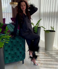 Discover our luxurious black women's wedding pajamas with elegant feather trim. These stunning pajamas feature exquisite feather trim on the sleeves and pants, adding a touch of glamour that sets them apart. Perfect for brides or anyone seeking luxurious sleepwear.
