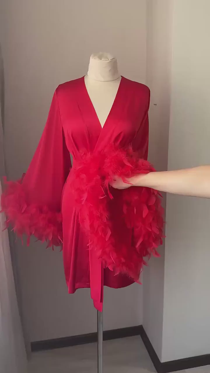 Red getting ready robe with feather sleeves Handmade